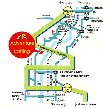 Nagoya Kansai,and Takayama customers who want to take the highway bus from Gifu.If you arrive at Gifu station by JR or Shin(New) Gifu station by the Meitetsu line.The bus terminal is just a short walk from bus stations.There are convenient buses leaving hourly.The highway bus from Gifu takes one hour.You will take the Gifu- Hachiman line.Get off the bus at Gunjominami(郡上美並) Click on the above blue area to sea a map and exact times of departure.(Sorry this is written only in Japanese) Please call Adventure Rafting 0575-79-3405 as soon as possible to arrange pick-up times.